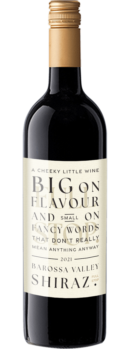 The Full Stop 2021 Barossa Shiraz is a bold red wine that often boasts deep, dark fruit flavors like blackberry, plum, and cherry. Its full-bodied nature is complimented by spicy notes of black pepper, anise, with hints of chocolate or leather. The wine typically has a robust tannin structure.